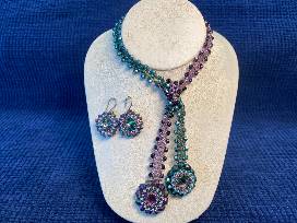 Leslee Frumin Design green and purple beaded lariat necklace and earrings. Handmade by Ellen Kroll. Valued at $150.