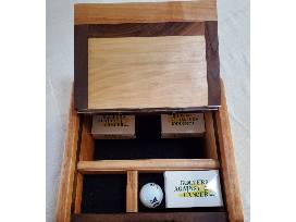 Howling dog boxes can be found in elegant homes across the country. Each howling dog box is unique - no two are alike nor ever will be. After conception of the design a single craftsman personally selected the fine hardwoods that will be used to make up the item, choosing from cherry, walnut, maple, mahogany, pecan and hickory to name a few. Please know your box has been finished with multiple applications of mineral oil followed by hand buffing. Refinishing can be accomplished using fine sandpaper followed by a wipe with a soft cloth and application of a wood conditioner. The entire howling dog team thank you for your support of Golfers Against Cancer.