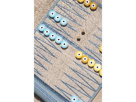 This backgammon board from Hellenic Aesthetic was designed with travel in mind. It's large enough to play a proper game but rolls up small enough to fit inside your tote or backpack. The board is expertly handcrafted in Athens from real pebbled leather featuring Natural Greek Fabrics linen on the interior. The poulia, or stones, were handmade in Greece in the shape of an evil eye.