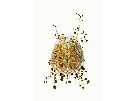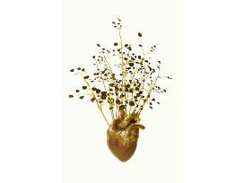 Costas Picadas' "Blossoming Anatomy" includes 3-D Model photo-based print works with hyper-real gold toned organs interspersed with delicate twigs that sprout small green leaves. The prints, entitled "Knee," "Heart," "Brain" and "Lungs," display an extreme realism that features golden disembodied organs set on a pure white paper ground that sparkle as if alive.