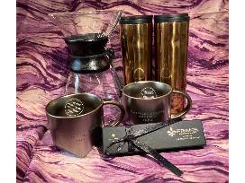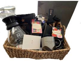 Basket includes: Starbucks Reserve Coffee Passport; Two 12 oz Seattle Reserve Mugs; Two 16 oz Travel Mugs; Box of Fran's Gray Salt Caramels in dark chocolate; Seattle Roastery Designed Chemex Coffee Pot and Melita filters; 8.8 oz bag whole bean Vietnam Da Lat: Notes of dried cherry and milk chocolate with a syrupy molasses sweetness; 8.8 oz bag whole bean Sun-Dried Zambia Ngoli Estate: Notes of sweet date, black currant and grapefruit zest with syrupy mouthfeel; 8.8 oz bag whole bean Hawai'i Ka'u Coffee: Notes of white peach, hazelnut and citrus zest with a brown-sugar sweetness; $150 Seattle Roastery Gift Card for any food, beverage, coffee tasting experience or merchandise at the Seattle Roastery.