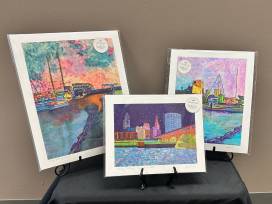 - Three gorgeous matted art prints featuring scenes from downtown CLE that were painted by local artist Dani Altieri Marinucci in her Westlake studio: CLE Starry, Starry Night (10"x12"); CLE 9th St. Pier at Dusk (13"x16"); CLE from the 9th St. Pier (11"x14")