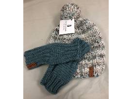 Number 4 set has a multi colored hat in shades of light turquoise, tan and cream that is perfectly complimented by light turquoise colored fingerless gloves.