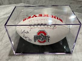 Collectors Football in acrylic case, stitched with Buckeye's logo. Signed by Ohio State Football Coach Ryan Day.