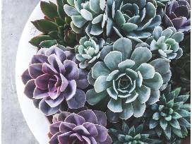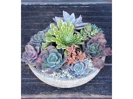 A beautiful pair of large round pots filled with an abundant display of live succulents.