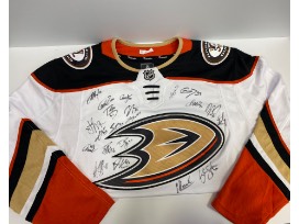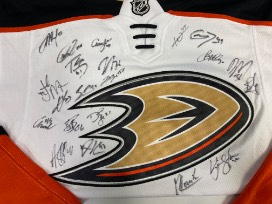 An Anaheim Ducks jersey signed by the 2021-2022 Anaheim Ducks team.