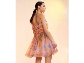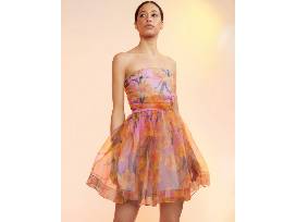 The Cynthia Rowley Daffodil printed strapless organza dress has a layered organza strapless top. It has an all-over daffodil print, has a gathered tier at waist, is fully lined, has an exposed contrasting back zipper, a ballerina inspired skirt, is mini length and its fabric content is 100% polyester. Care instructions: Dry clean. Size: 8.