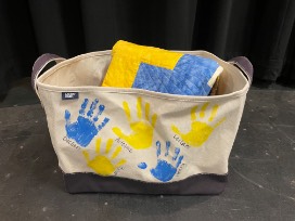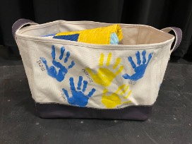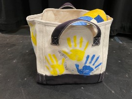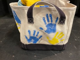 The canvas storage tote is decorated with each Kindergarten student's handprint.