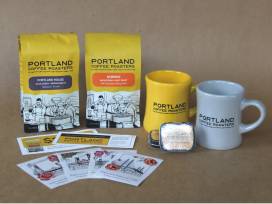 You're bidding on a Gift Basket from Portland Coffee Roasters! Includes two bags of coffee, two logo ceramic mugs, mints, and coffee coupons.