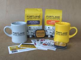 Donated by Portland Coffee Roasters: "Since our founding in 1996, Portland Roasting Coffee has sourced our coffee directly from farmers while building sustainable relationships with them and the communities they support. For more than 20 years we've worked to create lasting connections extending from our local community to our farmers, our customers and partners. These connections are at the heart of our business, and allow us to focus not just on coffee, but on improving both people and planet."