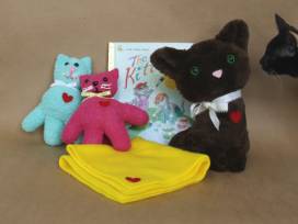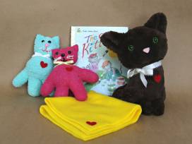 You're bidding on a bundle of cat treasures, including three cat stuffies, one kids book, and a small blanket!