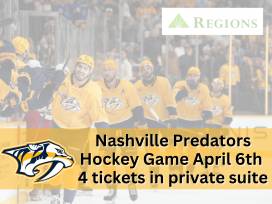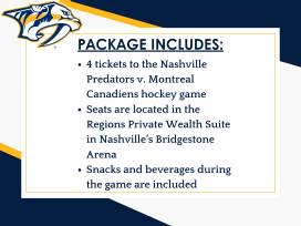 Enjoy the excitement of NHL action in ultimate comfort with 4 tickets to the Regions Private Wealth Suite at Bridgestone Arena on April 6. Watch the Nashville Predators take on the Montreal Canadiens from your private suite, featuring premier seating and an exceptional view of the ice. This luxurious package includes a selection of delicious snacks and beverages, ensuring a game night experience to remember. Perfect for hockey fans or anyone seeking a memorable evening of sports and luxury!