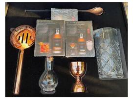 - A 5-piece copper & crystal Manhattan cocktail set (jigger, bar spoon, bitters bottle, strainer, mixing glass)