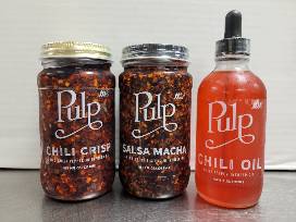 Pulp Hot Sauce's "Best Of" Collection! This collection includes a bottle of Chili Crisp, Salsa Macha, Chili Oil, vacuumed-sealed three heads of black garlic, and four bottles of Pulp Hot Sauce (Habanero Carrot, Fresno Chili Pepper, Poblano Serrano, and Hungarian Wax Pepper).
