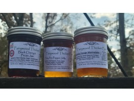 Gift box of Three Jams from Fairywood Thicket Farm. Includes a Black Cherry & Pecan, Fairy Fire Pepper Jelly, and Georgia Satsuma Orange Marmalade.