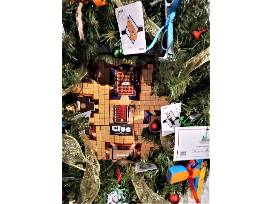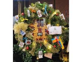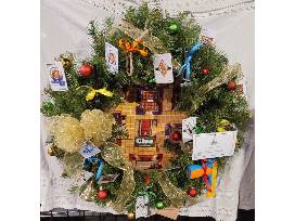 Included--Battery-operated, lighted 30" wreath with decorations and gifts: