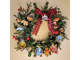 Included--Battery-operated, lighted 30" wreath with decorations and gift card: