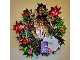 Included--Battery-operated, lighted 30" wreath with decorations and gift card: