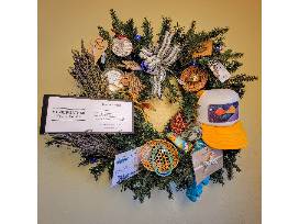 Included--Battery-operated, lighted 30" wreath with decorations and gift card: