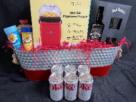 Whether you're hosting a party, or just looking for a fun activity to do with friends and family, this basket has everything you need for a fun movie night. Features and iLive THE2021BDL Pop-up Movie Theater Kit and 2 Adirondack Chairs. It also includes a bottle of Jack Daniels whiskey, Diet Coke, a hot air popcorn maker, popcorn kernels, ranch, and butter topping for the perfect snack during the movie.