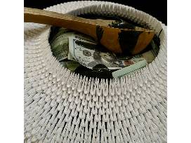 Medium: Paper, pine pitch, carved gourd, acrylic paint