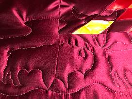 This design is one of my favorites. I've named it "Morning Prayer". This is the first time I've made it with satin materials. I also used my buffalo/ buffalo skull quilting pattern.