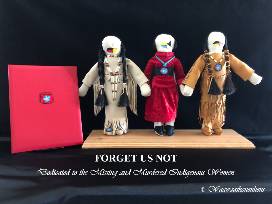 As a teenager, I hitchhiked across Canada alone. But for the grace of Creator, I could very well have been one of the missing or murdered. The FORGET US NOT Collection was inspired by the on-going tragedy of Missing and Murdered Women and how I escaped being counted amongst them. The poem was written first and inspired me to continue with the faceless dolls. The symbolism of the dolls is, though they are from three (3) different nations, they are holding hands representing sisters, who, despite their differences in customs, traditions, and geographical locations, stand together--united. Each 'sister' wears a forget-me-not flower either on her moccasins, belt, or necklace. The hands across their mouths symbolize no longer having a voice and the desperate need for us to be their voice-for us to forget them not-for all indigenous nations to stand together as one family to protect our SISTERS. The beadwork for the forget-me-not flowers was done entirely in my Signature modified Square stitch and is guaranteed from ever falling apart through normal wear and tear. Each bead, added one at a time, is individually sewn to each of the surrounding beads using only 100% silk thread. Using this stitch, each bead ends up with between 6 and 9 strands of thread through it. Durable and strong!