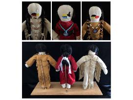 Medium: Beads, deer hide, pine wood, baling wire, horse hair, silk thread, synthetic sinew, gemstones, hairpipe bone, muslin dolls, FORGET US NOT poem & certificate holder