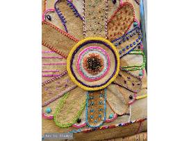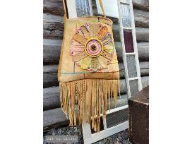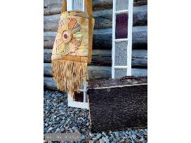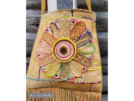 Inspired by both personal familial experiences as a youth and songs that not only describe these experiences but draw out the feelings that were felt during these times. Specifically, growing up in a mixed heritage family, the struggles that we faced as a family and individually, including, poverty, exposure to familial alcohol related issues, witnessing and experiencing mental and emotional abuse at times, witnessing the aftermath of extended family members being physically abused, subject to, racism and discrimination, being an intergenerational survivor of residential school. Along with the positive experiences that morphed from our environment, compassion, a work ethic, a survivor mentality, helping the less fortunate, forgiveness, an appreciation and respect for all that we receive and experience in life, whether good, bad, or, indifferent. Love for the land, the waters, the animals, and, each other. Cultures rich in teaching, values and beliefs, and traditions. The patchwork symbolizes the many pieces, narratives and experiences, the putting together, sewing up, along with, the taking apart, undoing, all together, creating, reflecting the many chapters written and being written in our lives. The flower is the beauty that continues to grow, shine through, provide light in our journey. The use of embroidery floss to highlight, outline, or not, the use of beads to add texture and dimension, colors, melding, intermingling, like a kaleidoscope, used to reflect our ever changing feelings as it relates to our experiences. The bag can become heavy at times or lighter as we journey, based on our lived experiences, we may have the choice or not, to make them lighter, life is just that, altogether, it is how we carry them. The fringe lends itself to freedom of movement, the ability to move beyond where we are in our lives or remain, the choice is ours not always, thou. This special art wearable piece is a tribute to a song by Dolly Parton called "The Coat of Many Colors" and the retro, vintage flair of Janice Joplin.
