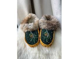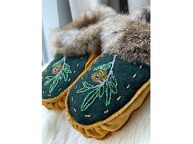 As a child I lived in Peru with my family. My home was in the district of San Isidro, Lima, Peru. Behind my home was a beautiful park named Parque de Olivares. In English that translates to Olive Tree Park. I used to go there daily with my sister and play and climb the olives trees that covered the whole park. It is one of my first and most memorable memories. I think because of how beautiful it is, and how much fun I had playing there, it's stuck in my head like it was just yesterday to this day. These moccasins have beaded olive tree branches, and the vamp is a deep green to represent the luscious greenery of the park.