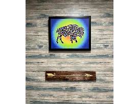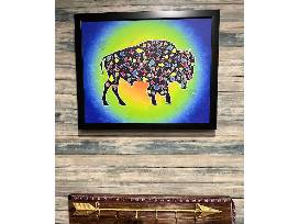 Inspired by the seven clans of the Otoe-Missouria Tribe. "Buffalo Clan" is one in a series of seven clan animal prints, Bear, Elk,Eagle, Beaver, Owl and Pigeon. Each animal has traditional tribal floral designs on black with white trim. The background is in very vibrant colors with floral designs fading into the background.