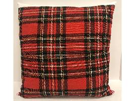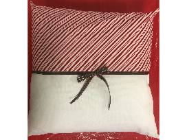 Handmade pillow by the women of Josephine's Place. This beautifully crafted, handmade seasonal pillow features a two panel front of ivory and red/white candy cane motif with a green fabric divider. The back side is 100% red tartan plaid. (18 inches square).
