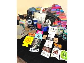 - From Bayern brewing: 1 green ball cap, small dry bag, L black t-shirt, L blue t-shirt, 2 Bayern painted beer pints, 2 pairs sunglasses, 2 koozies