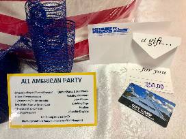 1Have a Star Spangled party with red, white and blue plates including a floral serving platter and popsicle shaped dessert plates that are reuseable! So cute!! Plus, disposable shot glasses, drink cups (assorted sizes) Star plates, sparkling decor, metallic silverware and more! Then, last but not least adorable wall art with blueberry muffin and pumpkin pie recipes. Bonus, a CD of all American-Music and $50 gift card for Kramer Foods! What a party!!
