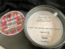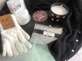 This beautiful group includes a black shawl and shrug in one in rich black accented with pearl buttons. Plus, some adorable white gloves-so soft! Then a sugar scrub and bio-based artisan soap from A Bar Above! Last, but not least a St. Jude candle created by Chase a St. Jude patient-black fig and olive scented adorned with smiley faces! How special is that! Plus, a silver glitter photo clutch holder! (16 4x6 photos.)