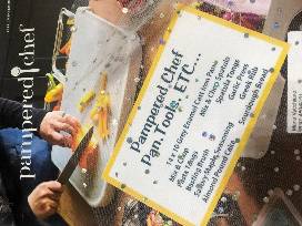 What a great Pampered Chef package! It starts with a 14x10 grey enamel cast iron pan. Plus, tools like pasta tongs, mix and chop spatula, and more. Then there's food like Almond Pound Cake mix and Sourdough Bread. Spices too- A gourmet cooks dream come true from Pampered Chef!