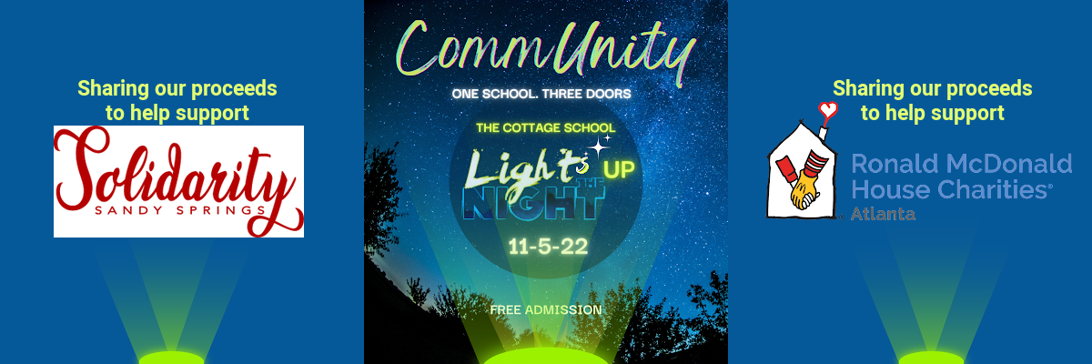 The event is free to attend, however, participants can purchase lanterns to guide them through the scavenger hunt and t-shirts to show support as they participate in various activities, including a collaborative art project. With a professional light show, free food, community business participation, and music, we anticipate a de-"light"-ful evening. Importantly, The Cottage School will share the light and the love with two other brilliant organizations by gifting a portion of event proceeds to the local food pantry, Solidarity Sandy Springs, and the Atlanta Ronald McDonald House.