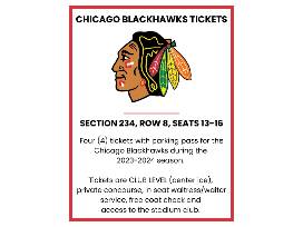 FOUR (4) TICKETS WITH PARKING PASS FOR THE CHICAGO BLACKHAWKS DURING THE 2023-2024 SEASON. TICKETS ARE CLUB LEVEL (CENTER ICE), PRIVATE CONCOURSE, IN SEAT WAITRESS/WAITER SERVICE, FREE COAT CHECK AND ACCESS TO THE STADIUM CLUB.