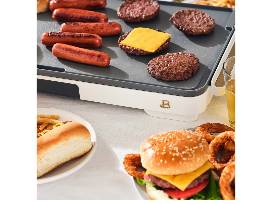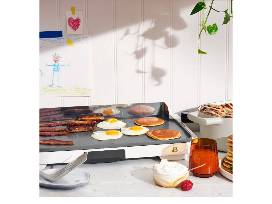 Pancakes and eggs for breakfast, grilled cheese for lunch, or burgers and dogs for dinner! Definitely designed for easy cabinet storage in our signature gold accents, the beautiful electric griddle is made for your kitchen and your lifestyle.