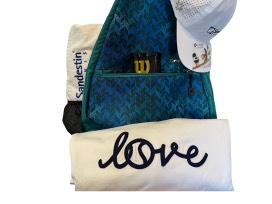 This Glove It tennis bag comes with all the gear you need to hit the courts in style: (1) Ame & Lulu "Love" sweatshirt, L (1) Vimhue Sandestin Tennis hat (1) Knockaround premium sport polarized glasses (1) tennis towel (1) can of tennis balls.