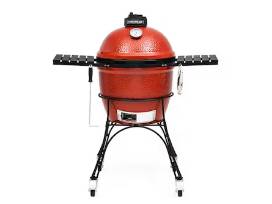 Everything but the meat in this package...18-in ceramic blaze red Kamado Joe Classic grill with cart and locking wheels, grill cover, and 20-lb bag of lump charcoal.