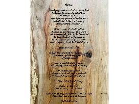 This live-edge solid olive wood Seaside School themed cutting board is a true work of art. Featured on the board is the carving of "The Goose," poem by Bob Stromberg, the Seaside School graphic and an ocean waves epoxy detail.