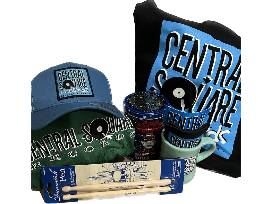Enjoy a $100 gift card, Central Square merch including a hat, cofffee mug, t-shirt, drumstick pens, koozie, sticker, bag, and Wide Spread Panic Coffee.
