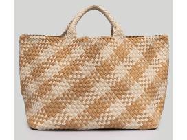 NAGHEDI almond plaid handwoven neoprene large tote. Lightweight and spacious; the St Barths Large Tote is made from signature handwoven neoprene. The perfect carryall beach bag!