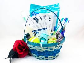 along with a basket including Veggiedent dental chews, a dog toothbrush, two toys, dog toothpaste, nail clippers and a waste bag holder