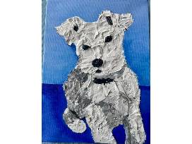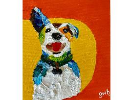 Quote from Gail: In the process of painting with acrylics, I've learned that even paint left on my palette can be transformed into another format for creative images. I take these uniquely shaped and colored post palette "skins" and reincorporate them back into a new image, in this case a 9 x 12 painting of your pet that will come ready to hang.