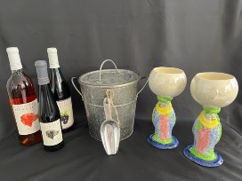 Enjoy a relaxing evening with two fish wine glasses, ice bucket, three bottles of Chateau Morrisette wine, while listening to music on your Sierra water resistant speaker.