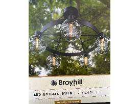 Brighten your space in industrial-inspired design using this Broyhill chandelier. Five globe covers surround the Edison-style LED lights that illuminate a warm hue. Conveniently battery operated and controlled by remote, this chandelier is a stunning addition to an indoor space or gazebo structure.
