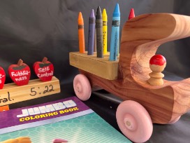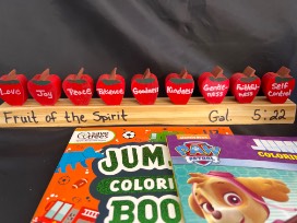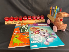 Bless the child in your life with this unique hand crafted wooden "fruits of the spirit" plaque and adorable truck crayon holder!