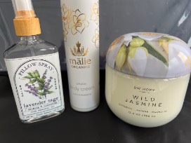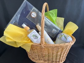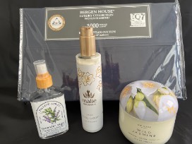 This basket contains a set of 1000 thread count navy queen sheets, lavender sage pillow spray, wild jasmine candle, and skin care product from Malie Organics.